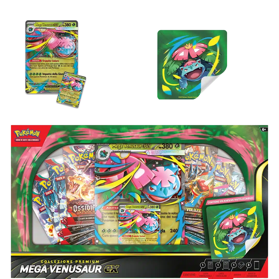 La collezione premium Mega Venusaur-ex del GCC Pokemon contiene: • Una carta promozionale olografica di Mega Venusaur-ex • Una carta promozionale lenticolare gigante di Mega Venusaur-ex • Un adesivo di Mega Venusaur • Otto buste di espansione del GCC Pokémon