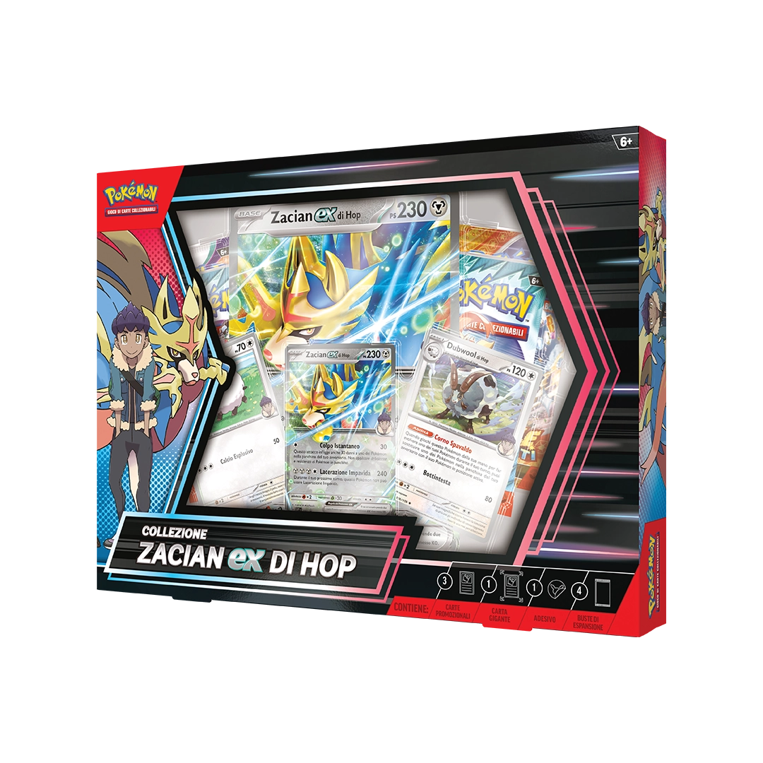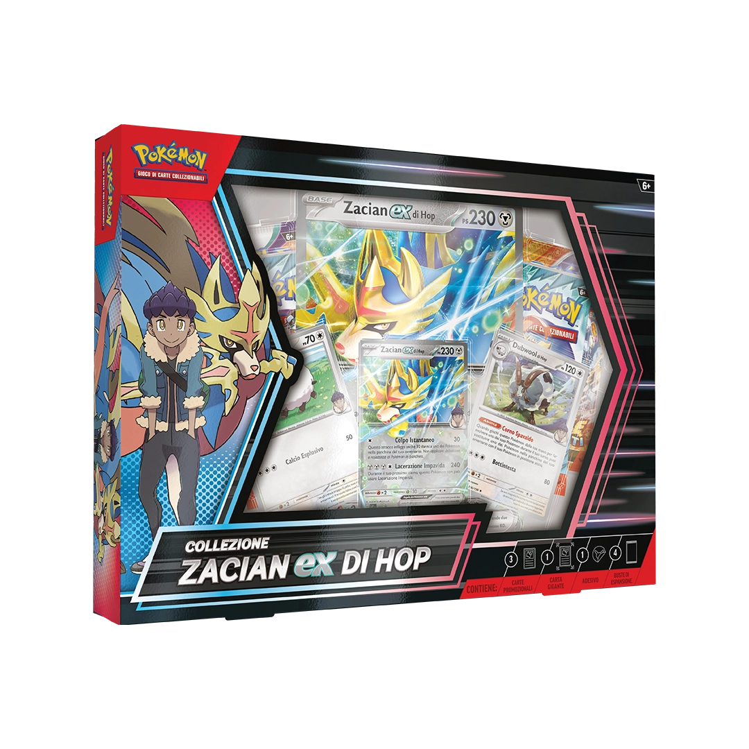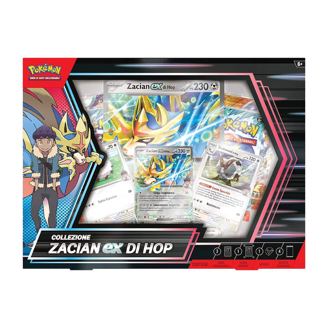La collezione Zacian-ex di Hop del GCC Pokémon contiene: • Una carta promozionale olografica di Zacian-ex di Hop • Due carte olografiche di Wooloo di Hop e Dubwool di Hop • Una carta olografica gigante di Zacian-ex di Hop • Un fotoadesivo • Quattro buste di espansione del GCC Pokémon • Una carta codice per il GCC Pokémon Live